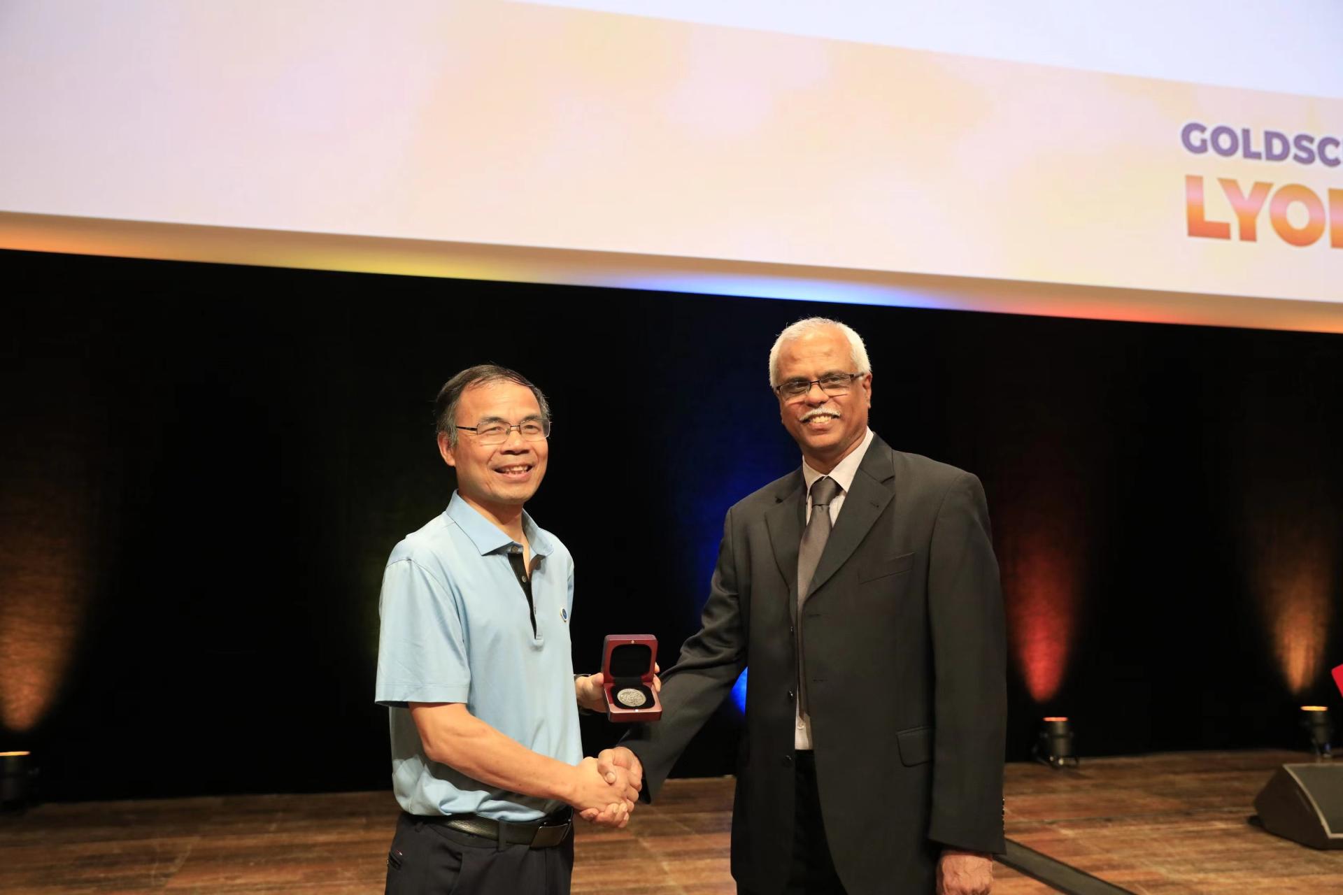 国际地球化学学会主席Sumit Chakraborty教授向谢树成院士颁发奖章